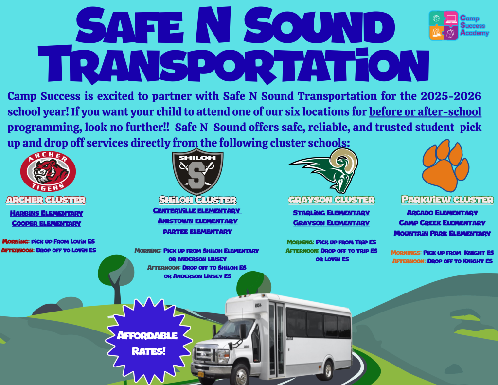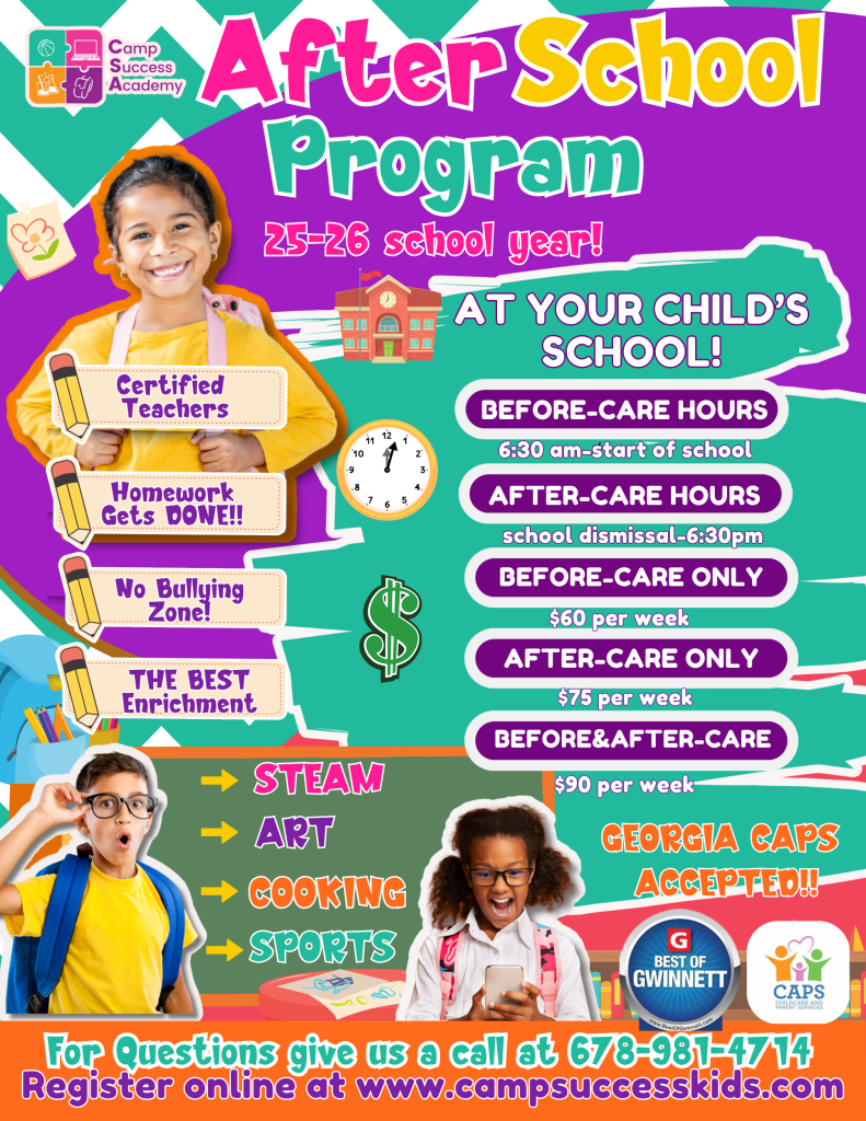 Voted Best of Gwinnett two consecutive years in a row and the only Three-Star Quality Rated after-school program in Gwinnett County! Camp Success Academy does it all! We provide homework assistance, daily enrichment, indoor field trips, private tutoring, private music and dance lessons, and a host of other activities that set us apart from the rest!